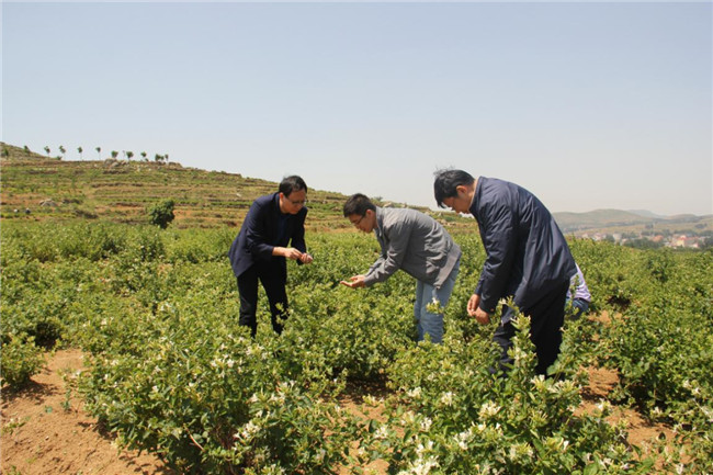 隨后,專家們來到了九間棚“六不用”金銀花種植基地,對平邑縣道地藥材金銀花的種植情況作實地調研。認真聽取基地負責同志匯報基地管理辦法,有機肥養地,殺蟲燈驅蟲,采用“六不用”管理技術:不用化肥、不用農藥、不用地膜、不用激素、不用除草劑、不用轉基因。專家對該基地的管理方法給予了充分的肯定,并親自采集金銀花樣品。